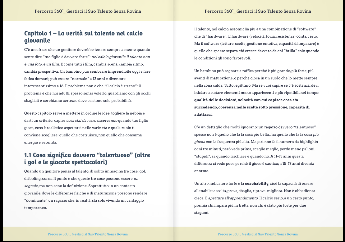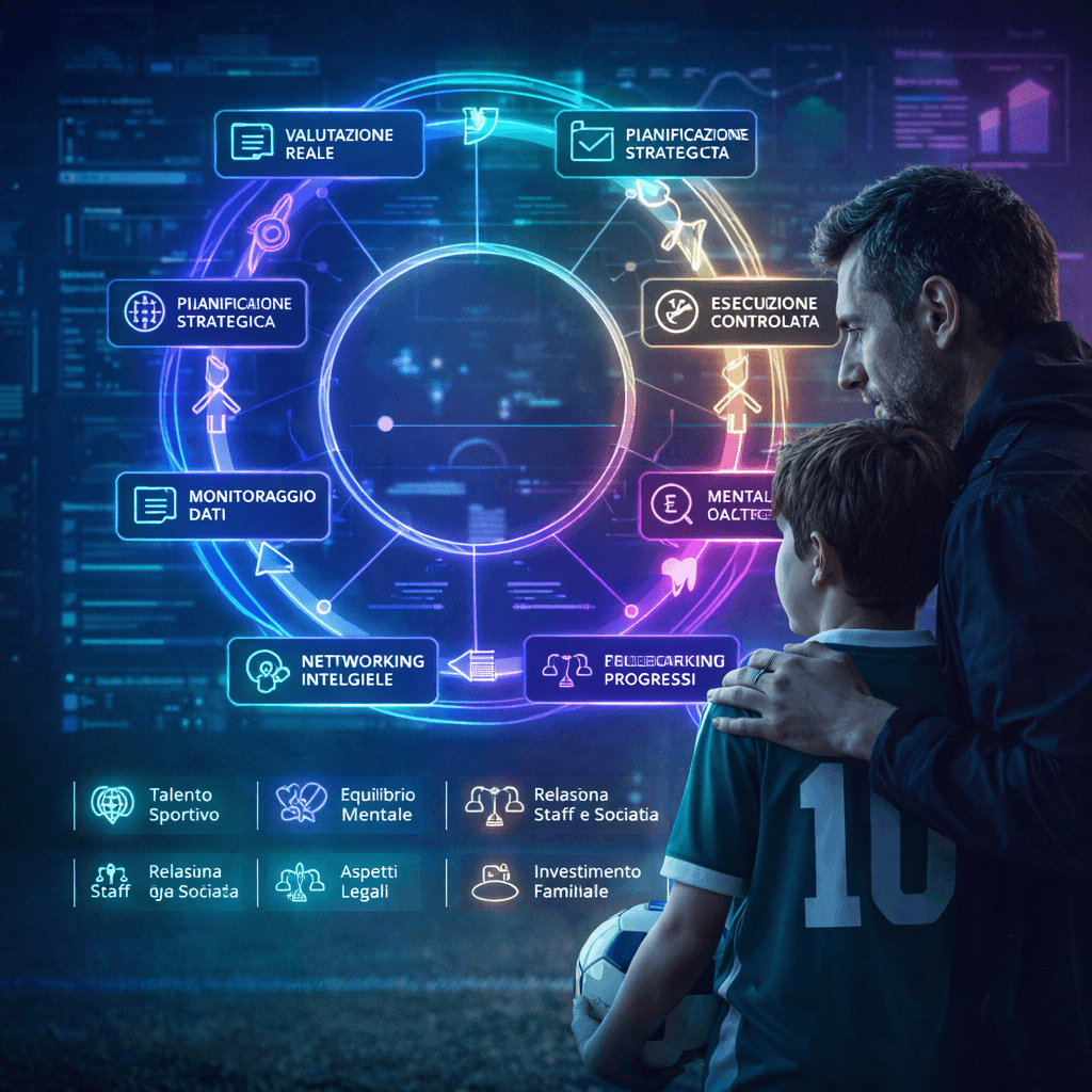 Il primo framework in Italia che guida i genitori in 8 fasi sequenziali per proteggere, sviluppare e valorizzare il talento sportivo – mentale, relazionale, legale e finanziario – senza caos, improvvisazione o illusioni.